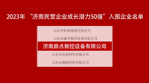 近日,濟(jì)南市民營經(jīng)濟(jì)發(fā)展局發(fā)布“濟(jì)南民營企業(yè)成長潛力50強(qiáng)”名單。濟(jì)南鼎點(diǎn)數(shù)控設(shè)備有限公司(以下簡稱“鼎點(diǎn)激光”)憑借高速發(fā)展,創(chuàng)新潛能等方面的優(yōu)異表現(xiàn)成功入圍“濟(jì)南民營企業(yè)成長潛力50強(qiáng)”榜單。