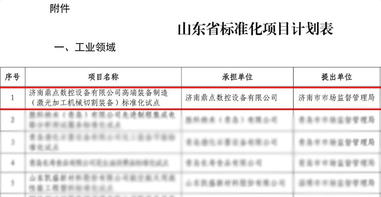 近日,山東省市場監督管理局正式下達省級標準化項目計劃。鼎點激光申報的工業領域標準化項目,經公示與審核,成功獲批立項。這是公司在標準化建設領域取得的一項重要突破,標志著技術創新能力與行業引領地位再次獲得權威認可。