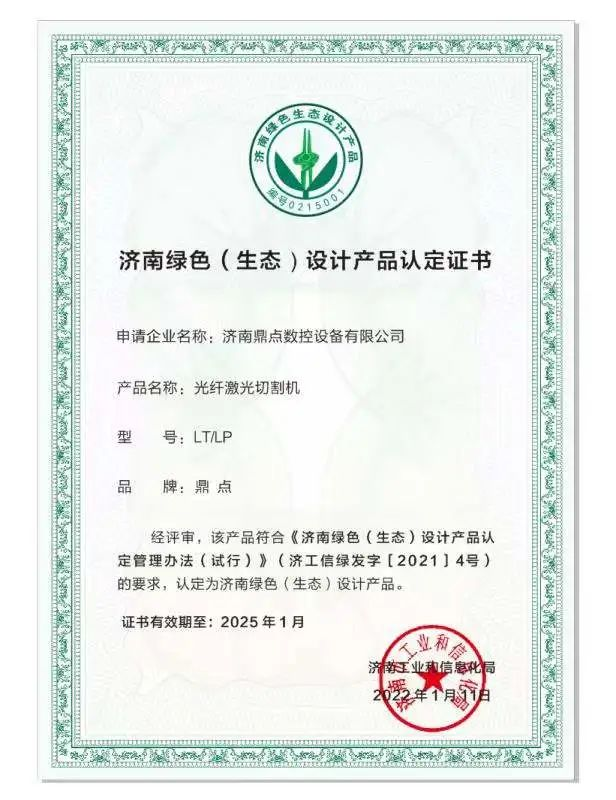 近日濟南市工業和信息化局文件公布了第二批濟南綠色(生態)設計產品認定名單的通知鼎點激光(濟南鼎點數控設備有限公司)位列其中。