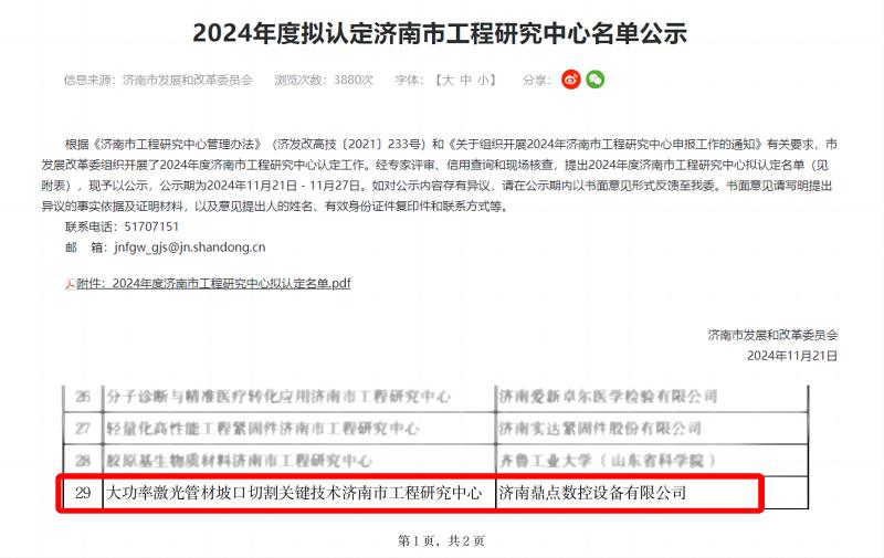 2024年11月28日,“大功率激光管材坡口切割關(guān)鍵技術(shù)濟(jì)南市工程研究中心”成功獲批。該中心由濟(jì)南鼎點(diǎn)數(shù)控設(shè)備有限公司與山東省科學(xué)院自動(dòng)化研究所聯(lián)合申報(bào),中心的研究方向是為大尺寸金屬管件、構(gòu)件的復(fù)雜加工提供一站式解決方案,設(shè)備可作為工業(yè)4.0系統(tǒng)終端,提供互聯(lián)網(wǎng)終端接口與信息交互軟件,并入ERP系統(tǒng)、遠(yuǎn)程操控軟件、故障遠(yuǎn)程監(jiān)控、信息自動(dòng)采集,為工業(yè)自動(dòng)化、無人化提供底層平臺(tái)。